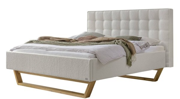 Dieses elegante Polsterbettgestell verbindet modernes Design mit zeitloser Eleganz. Das geradlinige, weich gepolsterte Kopfteil lädt zum entspannten Anlehnen ein und verleiht dem Bett eine edle Ausstrahlung. Die massiven Kufenfüße aus Wildeiche, natur geölt, sorgen für Stabilität und gleichzeitig für eine schwebend-leichte Optik.
