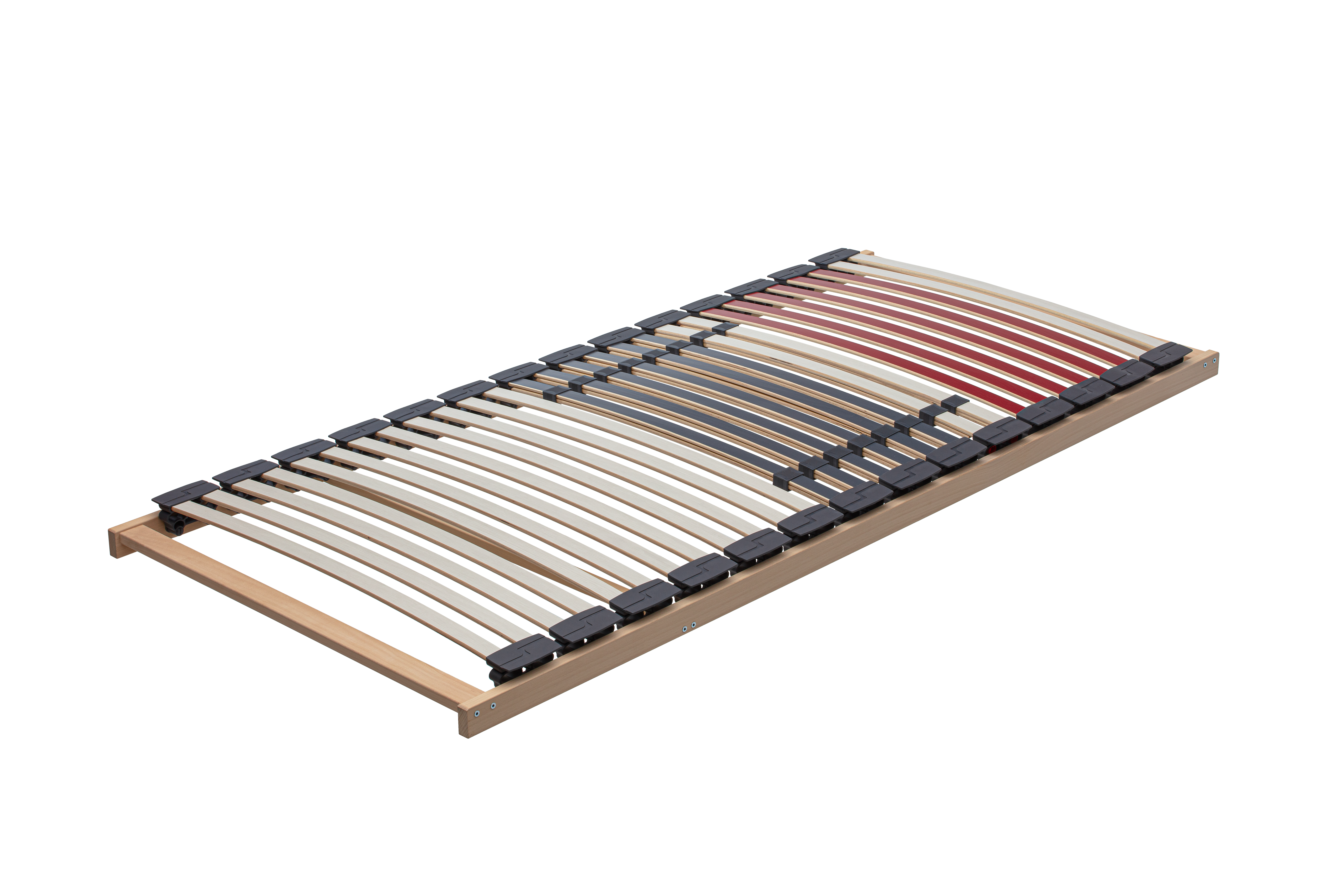 Der Rahmen besteht aus 28 mehrfach verleimten, federnd gelagerten Leisten aus elastischem Buchenholz. Dieses Qualitätsmaterial steht für Langlebigkeit, Flexibilität und eine gleichmäßige Druckverteilung.