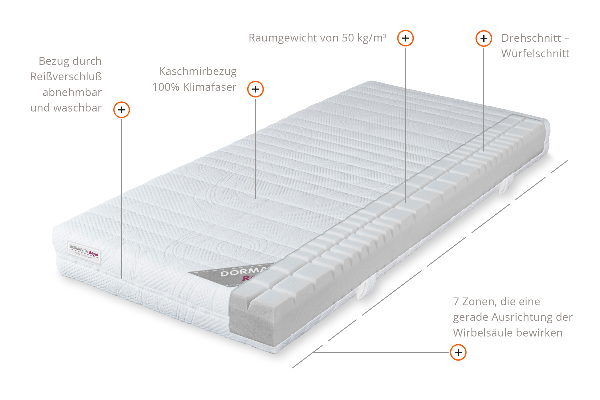 Mit einem Raumgewicht von ca. 50 kg/m³ bietet die Dorma Vita Royal eine langlebige und formstabile Liegefläche. Die Matratzenhöhe von ca. 18 cm sorgt zusätzlich für eine angenehme Ein- und Ausstiegshöhe.