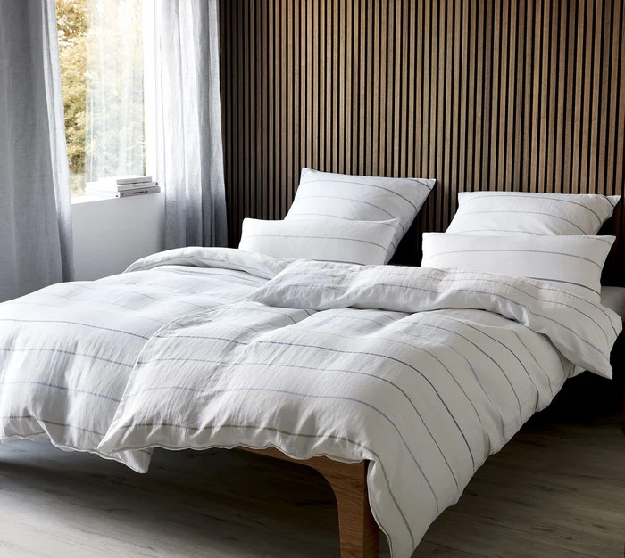 Die Bettwäsche ist aus einem Leinen-Baumwoll-Mix zeigt einen feinen Querstreifen im Farbmix für alle, die es dezent und dennoch raffiniert mögen.