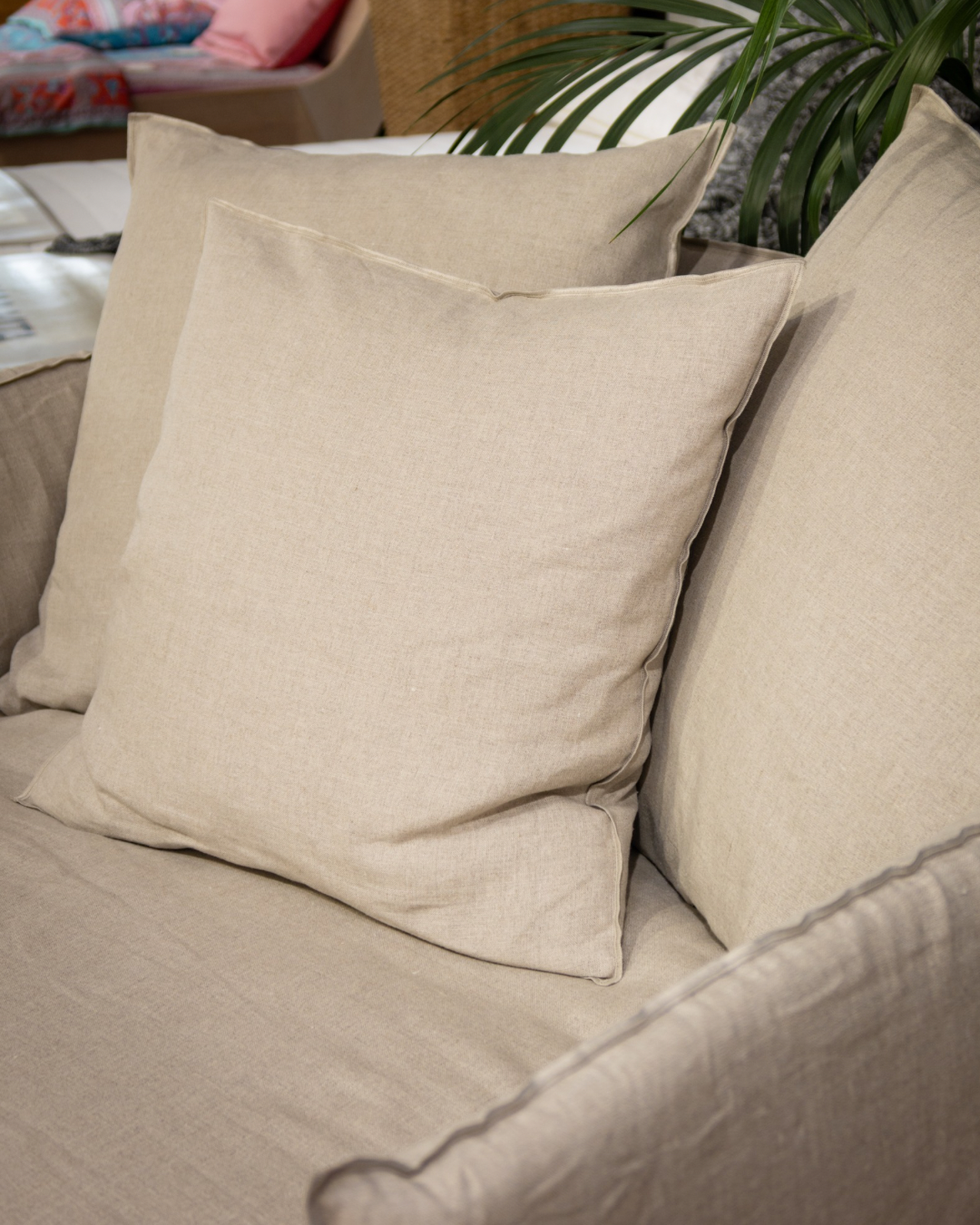 Die Basis bildet eine leichte, klar definierte Sitzfläche. Besonders charakteristisch ist der großzügig geschnittene, abziehbare Bezug mit dekorativen Nähten, der das textile Konzept des Sofas unterstreicht. Der Bezug lässt sich im Handumdrehen wechseln – für schnelle Anpassungen an Stil, Saison oder Raumwirkung.
