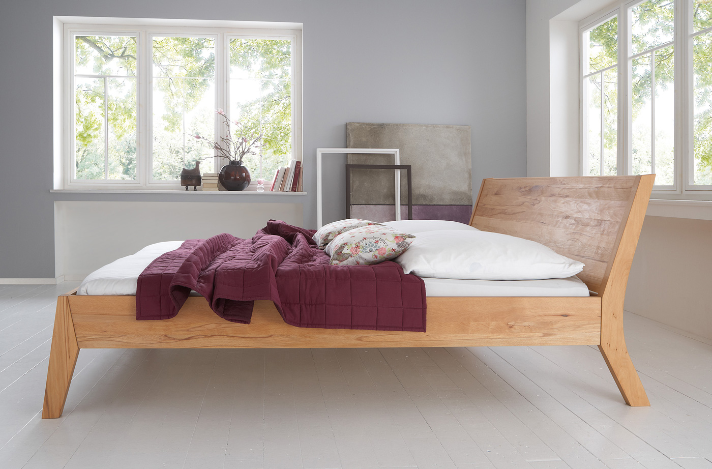 Modernes Massivholzbett mit elegant geschwungenem Kopfteil