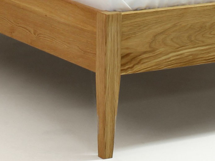 Dieses Massivholzbett wirkt durch das durchbrochene Kopfteil aus senkrechten Holzstäben ausgesprochen luftig und leicht, unterstützt durch grazile Füße und eine klare Formensprache. Die reduzierte Gestaltung in Senkrecht- und Waagerechten macht das Bettgestell zu einem eleganten Möbelstück, das zeitlos zu fast jedem Einrichtungsstil passt.